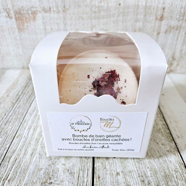 Le cadeau parfait pour offrir un moment de détente et un cadeau surprise. Une paire de boucles d'oreille surprise en acier inoxydable d'un modèle 3 en 1 dans une bombe de bain géante.